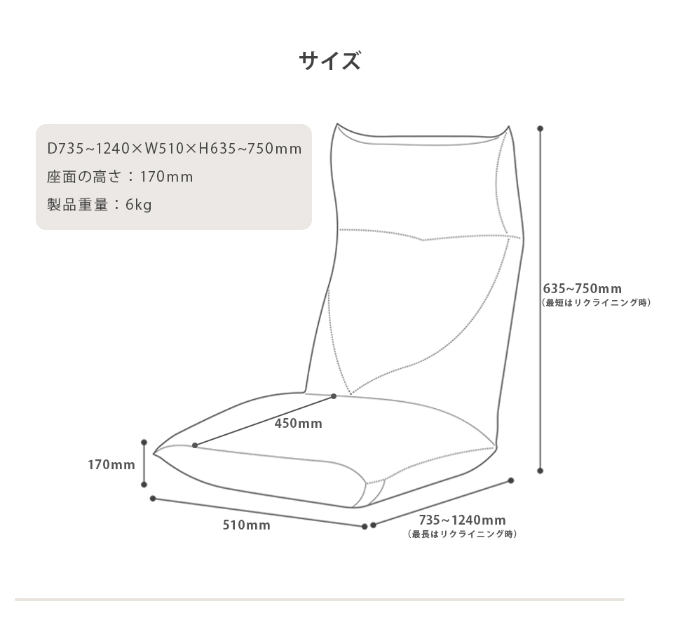 【サイズ】 幅510×奥行735〜1240×高さ635〜750mm SH170mm