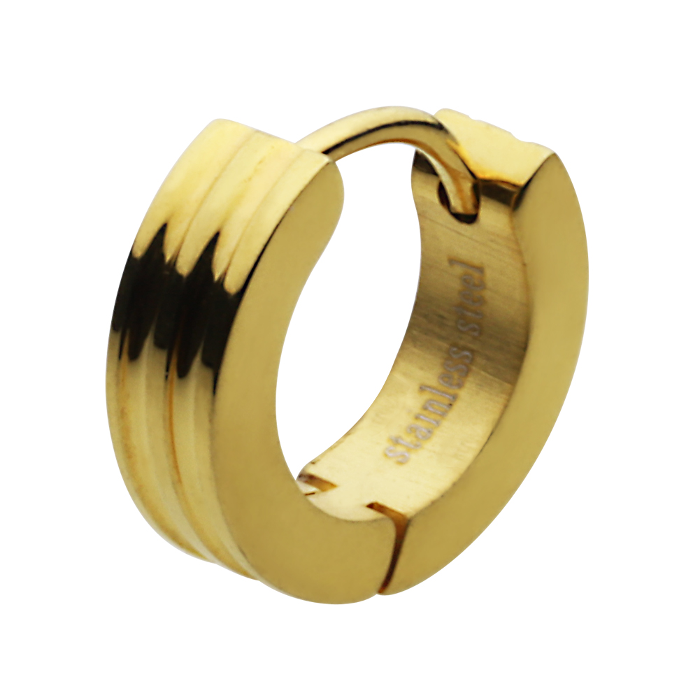 小振りなサイズにスタイリッシュなラインが映えるステンレスピアスです。ステンレスらしいカッチリとした装着感のあるフープピアスなので落としにくいです。表面のゴールドカラーのコーティングでアクセントとしても活躍してくれます。