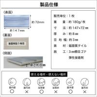 寸法:147×72 mm 半マスカット寸法:72x72mm 厚み:8.0 mm 重量:約80g/枚(ケース120枚=25kg) 平米必要枚数:89枚/m2 |