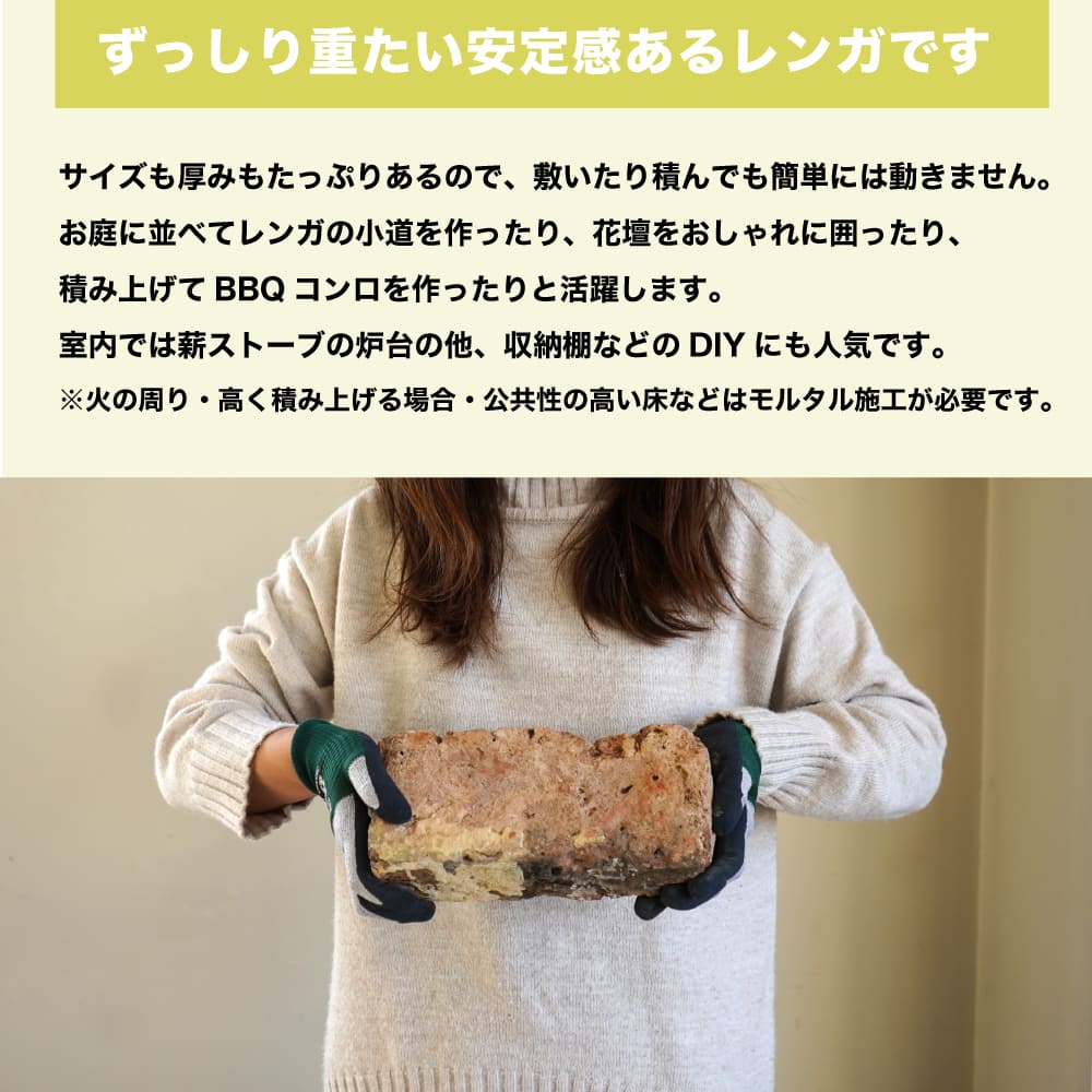 | ▼ガーデニングに使う・・・レンガのアプローチ レンガの門柱・塀 バラのアーチ 置くだけで花壇の囲い 植木鉢を置く花台 立水栓リメイク 階段 砂利・芝生の仕切り バーベキューコンロ ピザ窯 ファイヤーピット ▼DIYに使う・・・レンガと天板を組み合わせたテレビボードや靴棚・収納棚 ▼室内に使う・・・薪ストーブの炉台・遮熱壁 |