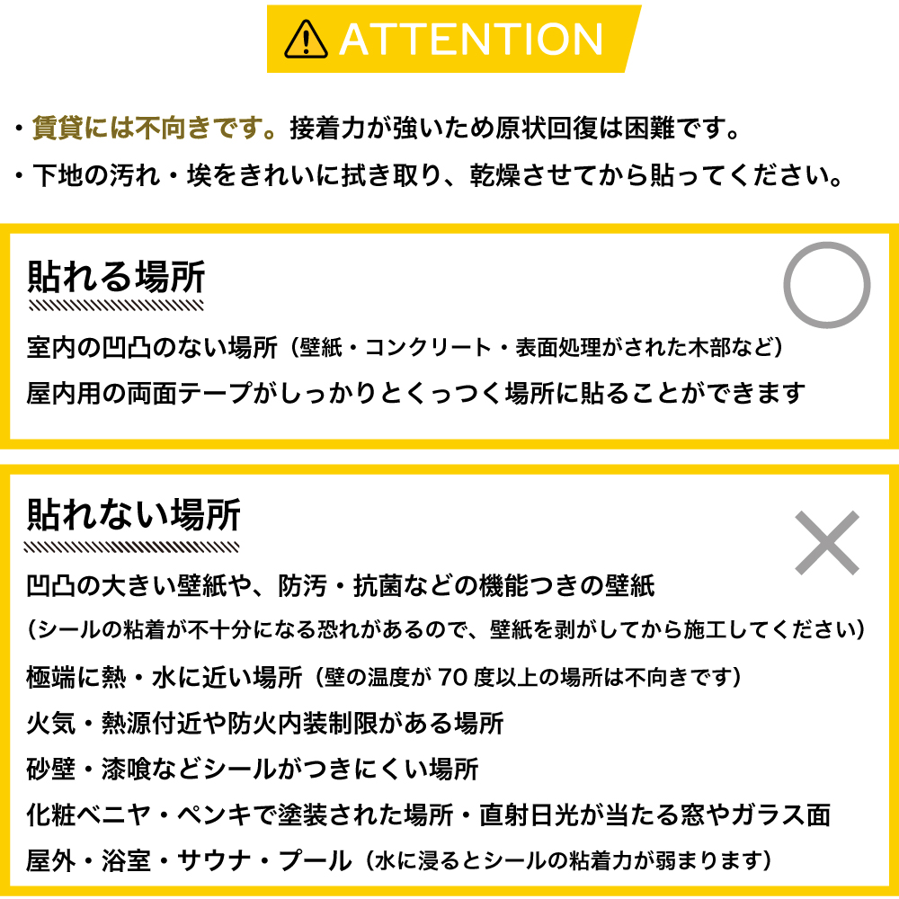 | 凹凸のある壁紙や、防汚・抗菌などの機能つき壁紙(シールの粘着が不十分になる恐れがあるので、 壁紙を剥がしてから施工してください) 賃貸の壁(接着力が強いため、施工後にきれいに剥がす事は困難です) 極端に熱・水に近い場所(シール部分が劣化する恐れがあります) 火気・熱源付近や防火内装制限がある場所(壁の温度が70度以上になる場所には施工できません) 砂壁などシールがつきにくい場所 化粧ベニヤ・ペンキで塗装された場所・直射日光が当たる窓やガラス面 屋外・浴室・サウナ・プール(シールの粘着力が弱まります) |