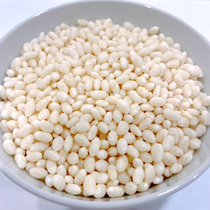 玄米粉と米粉を米型に成型したパフです。パン、スコーン、お茶漬けや雑炊、和菓子のトッピングなどに使用できる製菓材料です。