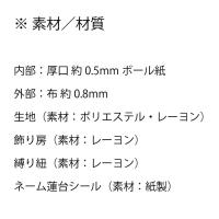 | 外 部 素 材 | 布:0.8mm 生地:ポリエステル・レーヨン 飾り房:レーヨン 縛り紐:レーヨン ネーム蓮台シール:紙製 |