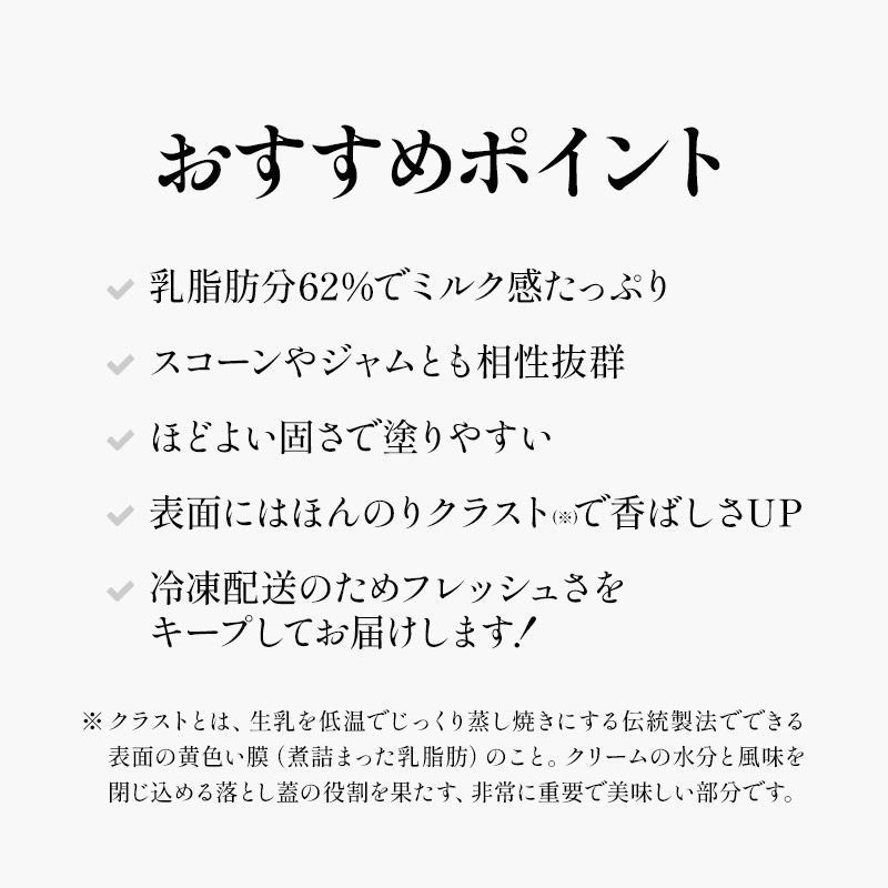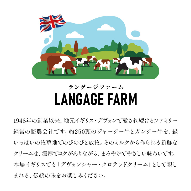 | 名称 ランゲージファーム 冷凍クロテッドクリーム 57g×1個 商品詳細 乳脂肪分62%と濃厚でミルキーな味わいが特徴! 日本でもファンも多いランゲージファームのクロテッドクリーム ”濃厚ミルクを味わう、ご褒美クリーム” まるで上質なバタークリームのようなコクと香り。スコーンやジャムの味わいにも負けない存在感で、いつものおやつがカフェ級に様変わり!しっかりとしたミルクの香り、でも重たくない絶妙バランスのご褒美クリームです♪ ”食べ過ぎ注意!コク深い味わい!” 乳脂肪分62%だから、コクがしっかり、そして奥深い味わい。口どけはなめらかで軽やかなので、ついつい食べすぎちゃう、そんなクリームです。ひと口食べた瞬間に広がる、濃厚ミルクの香りとやさしい甘み、そしてバタークリームみたいにリッチなのに、ふんわり軽い不思議な食感をお楽しみください◎ おすすめポイント! ・乳脂肪分62%でミルク感たっぷり ・スコーンやジャムとも相性抜群 ・ほどよい固さで塗りやすい ・表面にはほんのりクラストで香ばしさアップ ・冷凍配送のためフレッシュさをキープしてお届けします! イギリス・デヴォンの老舗酪農メーカー”ランゲージファーム”が作るクロテッドクリーム。1948年の創業以来、地元で愛され続けるファミリー経営の酪農会社です。約250頭のジャージー牛とガンジー牛を、緑いっぱいの牧草地でのびのびと放牧。そのミルクから作られるクリームは、濃厚でコクがありながら、まろやかでやさしい味わいが特長です。本場イギリスでも「デヴォンシャー・クロテッドクリーム」として親しまれる、伝統の味をお楽しみください。 ”こんな食べ方がおすすめ♪” ・焼きたてスコーンにたっぷり乗せて♪ ・お好きなジャムと一緒に”クリーム+ジャム”で二層仕立てに ・トーストやパンケーキにも! ・紅茶やコーヒータイムのおともにも 原材料名 牛乳(一部に乳成分を含む) 内容量 57g 賞味期限 お届け後30日以上 解凍後は3日以内にお召し上がりください。 保存方法 -18℃以下で保存 原産国名 イギリス 輸入者 ホブゴブリンジャパン株式会社 東京都港区南青山1-10-2 |