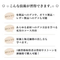 ハンカチや服、トートバッグなどの布製品へのデコ(HOTFIX)や、ガラス製品・レザー製品のデコ、球体や写真を加工したポートレートデコなどデコアートの全てを網羅する計10作品を作りながら学ぶ充実のコース内容です。