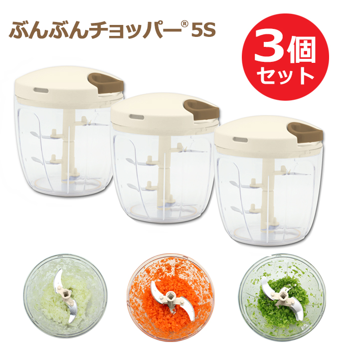 | [3個セット] ぶんぶんチョッパー5S(900ml)×3 保存用ふた×3 混ぜ器×3 レシピ×3 ※レシピ内容は製造時期によって異なります。 |
