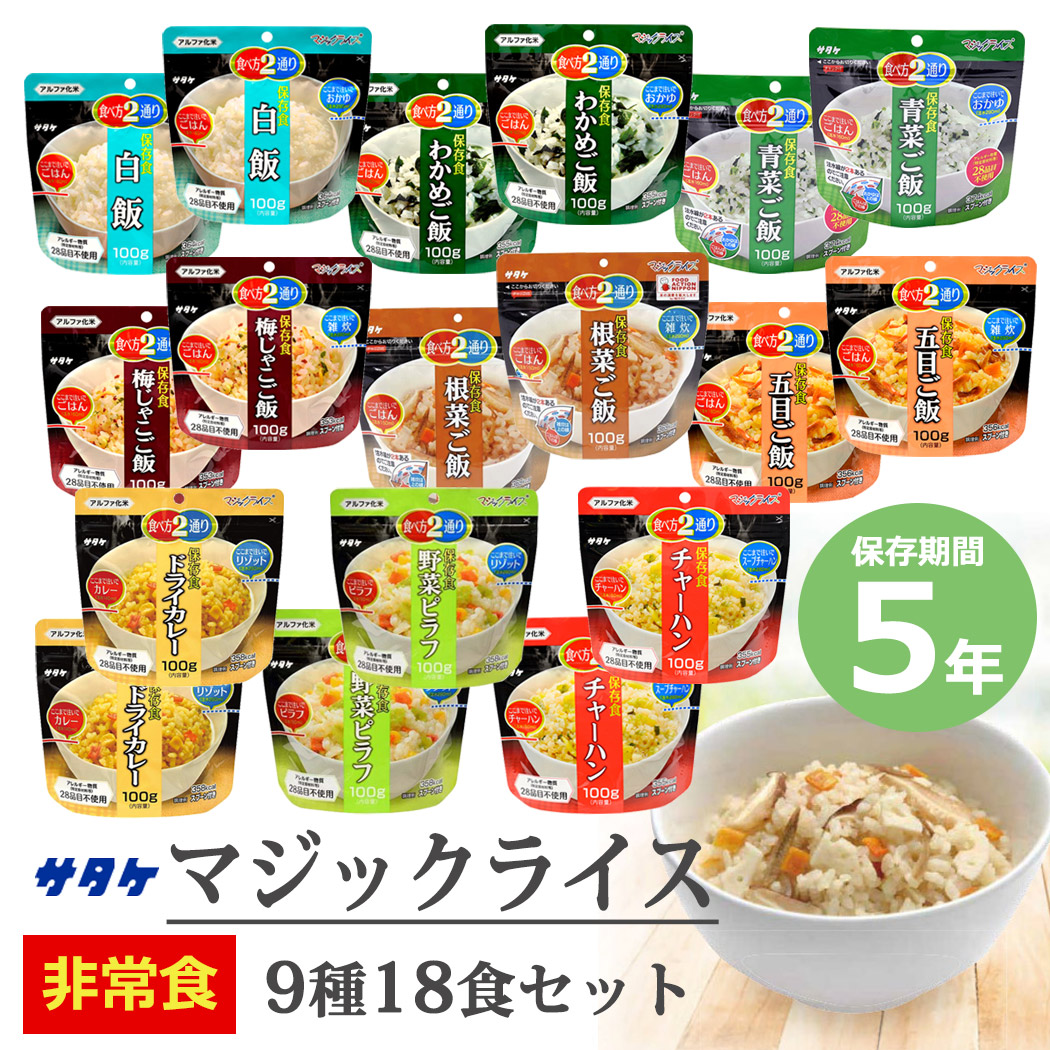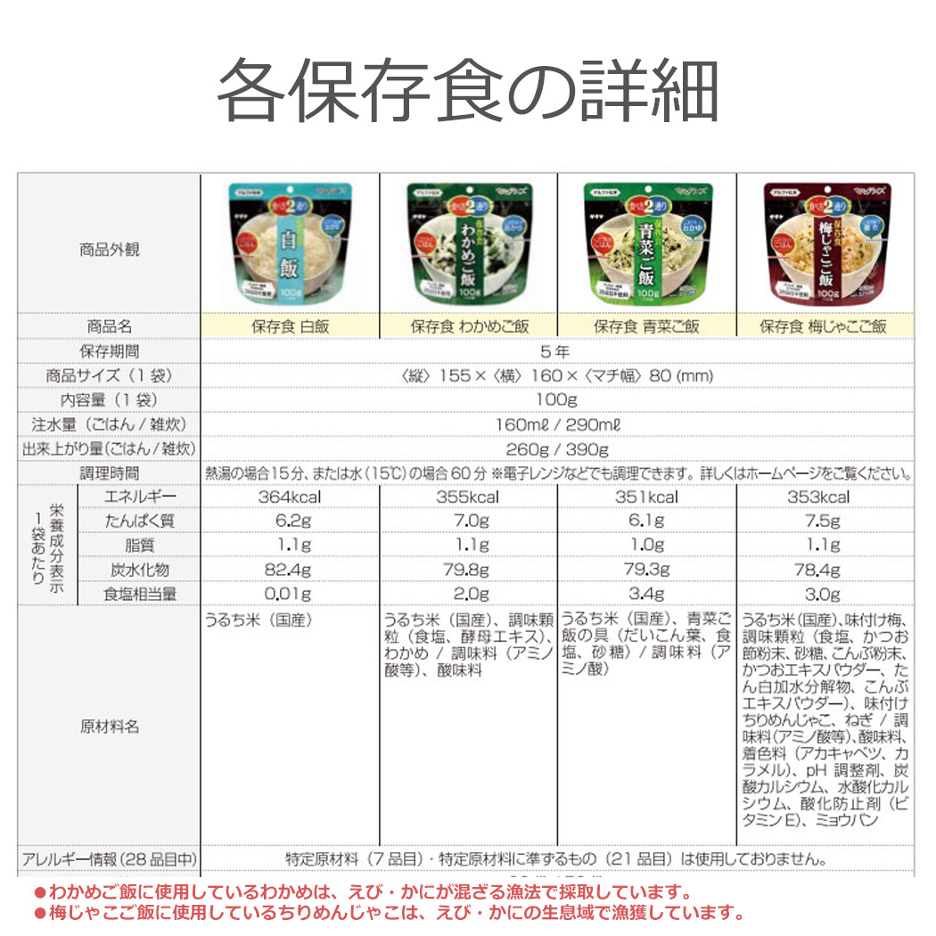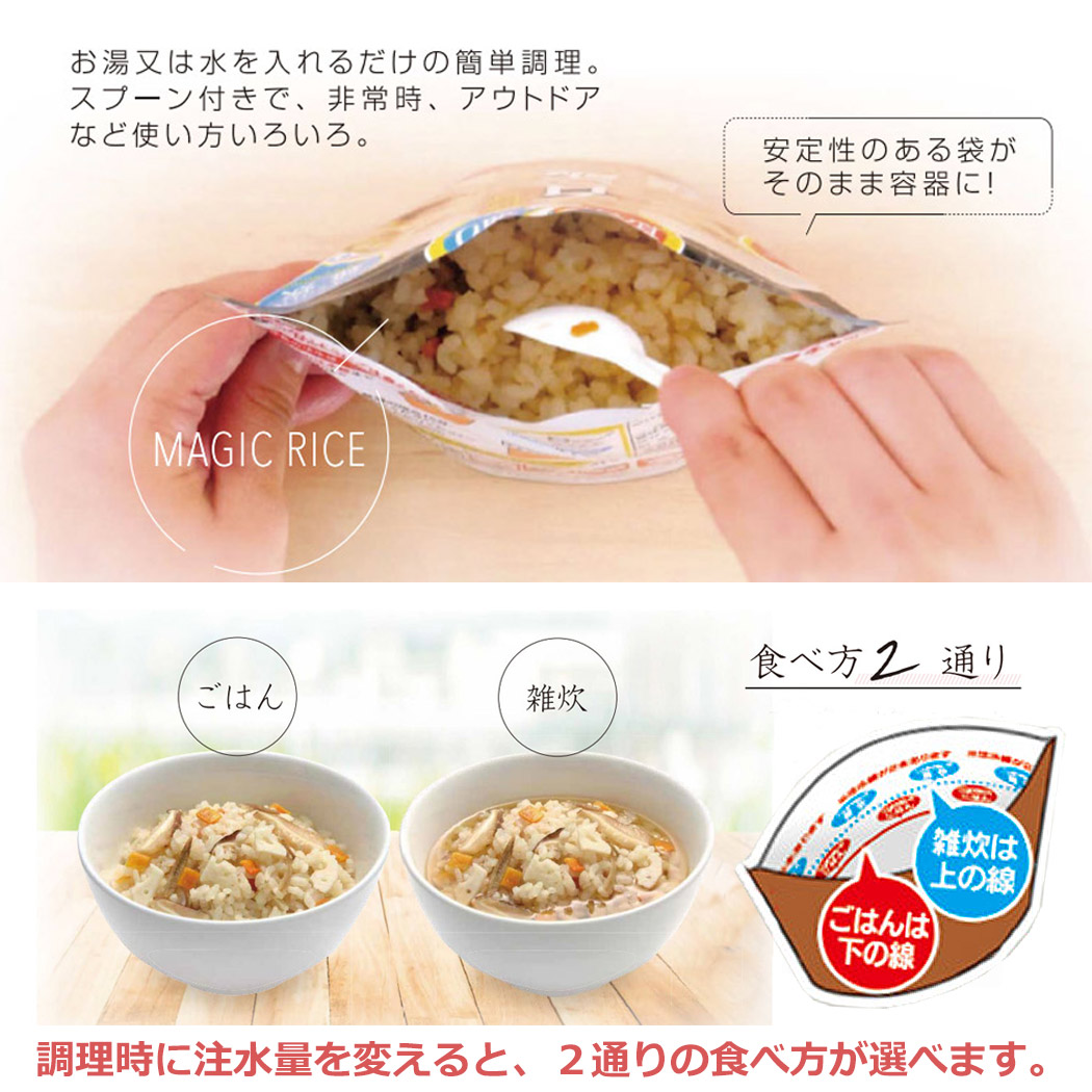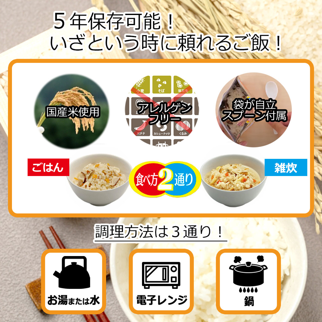 こちらは非常・保存食9種類18点セットのページです。 おひとり様、約6日分の非常食として。分けあってご家族分として。 賞味期限の近いものの、詰め替え用として。キャンプ、アウトドアでの使用に。 お友達、ご近所様と分け合い。企業様、自治体などの備蓄用に。 製造より5年保存可能! ※流通の段階で多少のお時間がかかるため、お手元に届く際には賞味期限が5年を切る場合もございます(賞味期限4年6ヶ月以上を保証) すべて国産米を使用し、非常用持ち出し袋などにセットしたり、キャンプなどでもお使いいただける美味しく手軽なごはんです! 非常用持ち出し袋の中に追加したり、ご家族用にご用意される時にぴったりの単品販売となります。 アウトドア、キャンプでもお使いいただけます! -セット内容- ●白米 ×2 ●わかめご飯 ×2 ●青菜ご飯 ×2 ●梅じゃこご飯 ×2 ●根菜ご飯 ×2 ●五目ご飯 ×2 ●ドライカレー ×2 ●野菜ピラフ ×2 ●チャーハン ×2 総合計18点のセットとなります。 ■原産国:日本 -ご注意- ■災害発生後はご注文が非常に殺到いたします。納期にお時間をいただく場合がございます。セット内容は予告なく、同等の品に変更になる場合がございます。 また、発送・お問い合わせのご返答にはお時間を頂戴いたします。ご了承ください。 ■商品サイズ・カラーは、企画サイズとなります。 ■商品画像につきましては、モニターの種類・設定等により、実際の商品とは素材感や色味が異なる見え方をする場合があります。 ■細かなキズや、製造上避けられないシミ・シワなどがある場合があります。 ■商品仕様は、予告無く仕様変更される場合がございます。また、セット内容は予告なく同等の品に変更になる場合がございます。予めご了承下さい。 ■商品によっては、他店と在庫共有しているものがございますので、ご注文を頂戴した時点で、 在庫が確保できない商品につきましては、 ご注文をキャンセルさせていただく場合がございます。 なにとぞ、ご了承の程、よろしくお願いいたします。 |