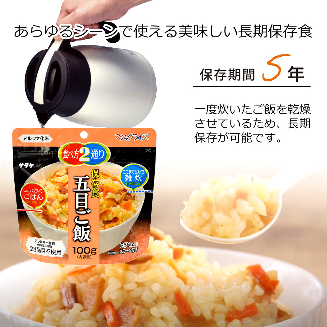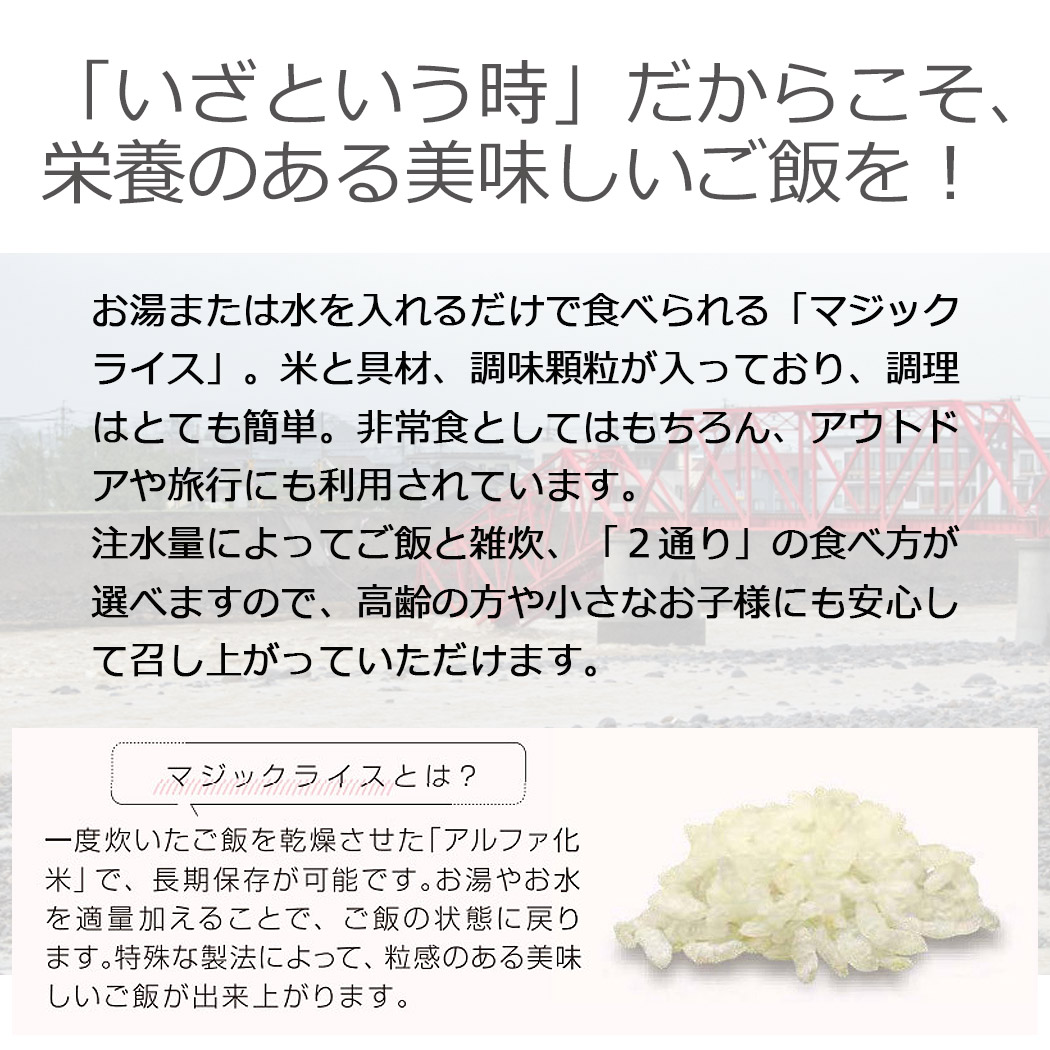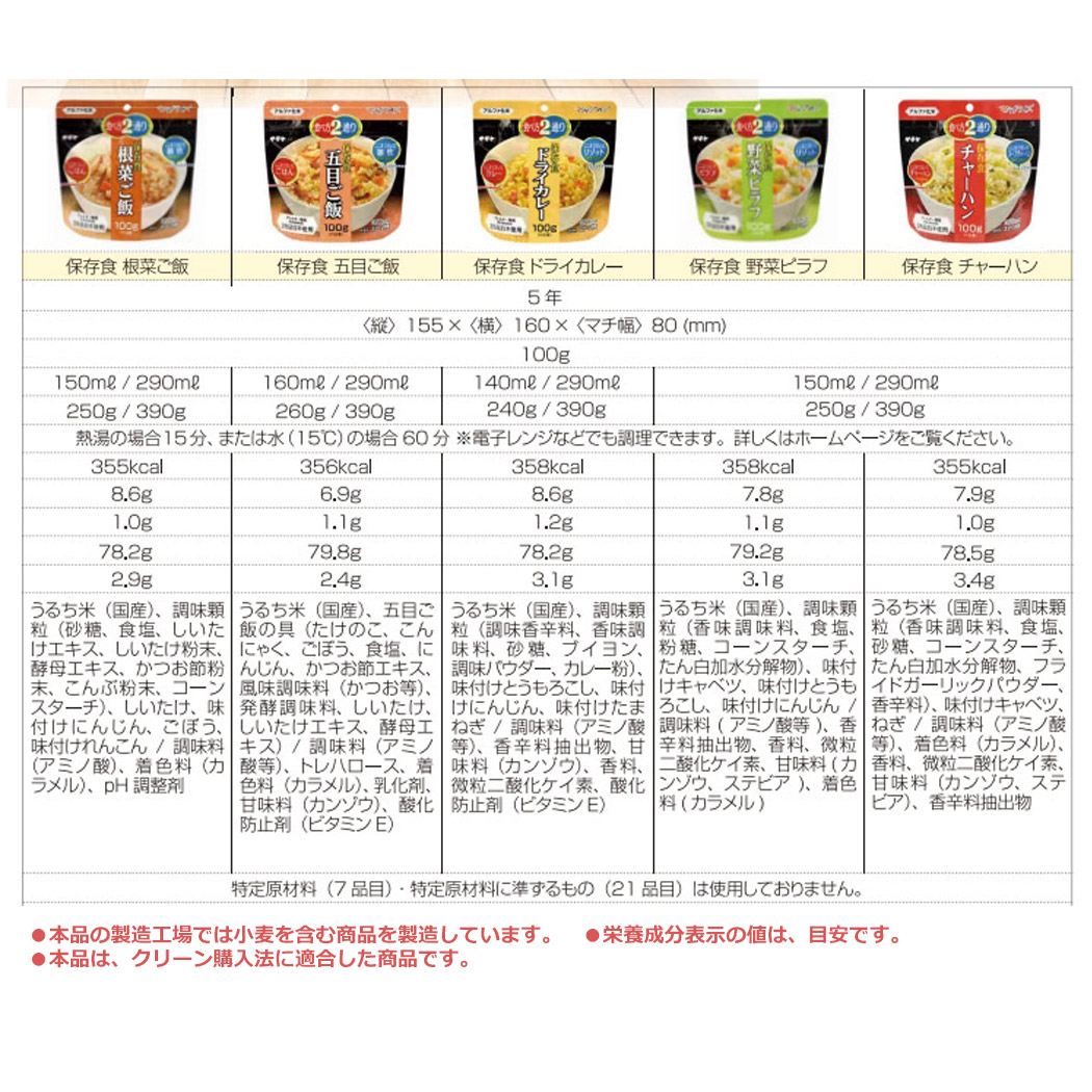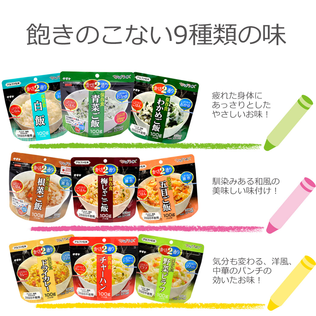 こちらは非常・保存食9種類18点セットのページです。 おひとり様、約6日分の非常食として。分けあってご家族分として。 賞味期限の近いものの、詰め替え用として。キャンプ、アウトドアでの使用に。 お友達、ご近所様と分け合い。企業様、自治体などの備蓄用に。 製造より5年保存可能! ※流通の段階で多少のお時間がかかるため、お手元に届く際には賞味期限が5年を切る場合もございます(賞味期限4年6ヶ月以上を保証) すべて国産米を使用し、非常用持ち出し袋などにセットしたり、キャンプなどでもお使いいただける美味しく手軽なごはんです! 非常用持ち出し袋の中に追加したり、ご家族用にご用意される時にぴったりの単品販売となります。 アウトドア、キャンプでもお使いいただけます! -セット内容- ●白米 ×2 ●わかめご飯 ×2 ●青菜ご飯 ×2 ●梅じゃこご飯 ×2 ●根菜ご飯 ×2 ●五目ご飯 ×2 ●ドライカレー ×2 ●野菜ピラフ ×2 ●チャーハン ×2 総合計18点のセットとなります。 ■原産国:日本 -ご注意- ■災害発生後はご注文が非常に殺到いたします。納期にお時間をいただく場合がございます。セット内容は予告なく、同等の品に変更になる場合がございます。 また、発送・お問い合わせのご返答にはお時間を頂戴いたします。ご了承ください。 ■商品サイズ・カラーは、企画サイズとなります。 ■商品画像につきましては、モニターの種類・設定等により、実際の商品とは素材感や色味が異なる見え方をする場合があります。 ■細かなキズや、製造上避けられないシミ・シワなどがある場合があります。 ■商品仕様は、予告無く仕様変更される場合がございます。また、セット内容は予告なく同等の品に変更になる場合がございます。予めご了承下さい。 ■商品によっては、他店と在庫共有しているものがございますので、ご注文を頂戴した時点で、 在庫が確保できない商品につきましては、 ご注文をキャンセルさせていただく場合がございます。 なにとぞ、ご了承の程、よろしくお願いいたします。 |