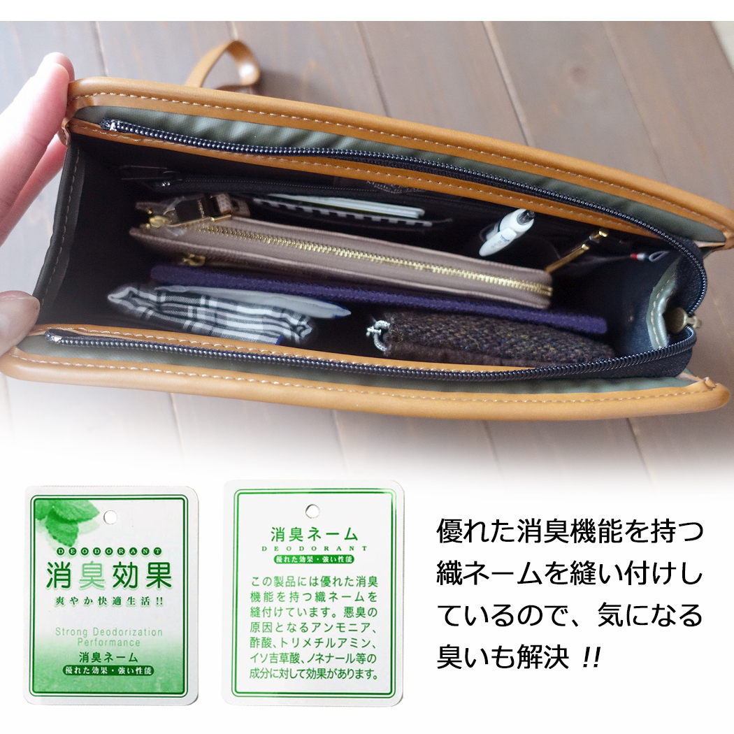 ヨコ約26cm × タテ約19cm × マチ約6cm、重さ約350g。軽量で持ち運びやすく、必要な小物をすっきり収納できます。