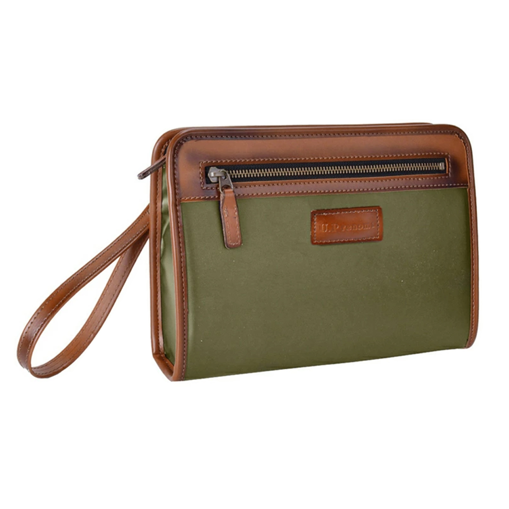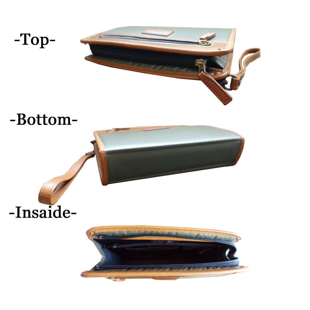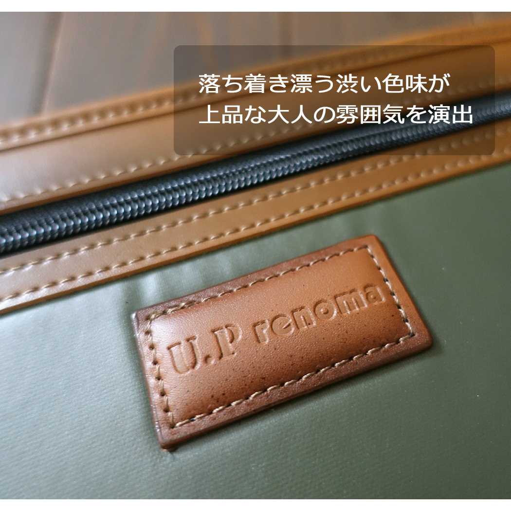 本体は耐久性に優れた合成皮革、引手とワッペンには本革を使用。落ち着いた雰囲気のブラック/グリーンのカラー展開で、ビジネスにもカジュアルにも合わせやすい。