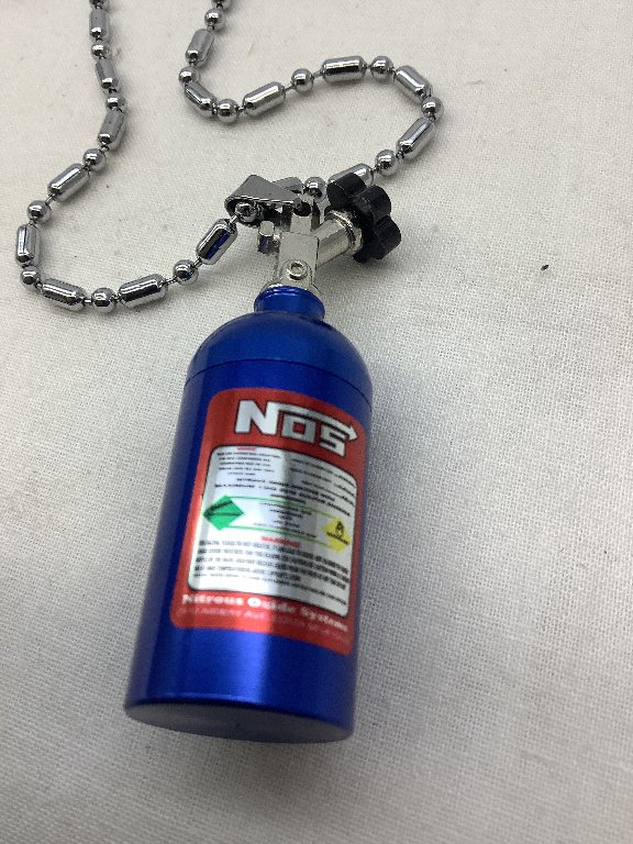 NOS a.k.a. Nitrous Oxide Systems 映画、ワイルドスーピードでドムとレティ ガンガンに使ってましたねぇ。 ただのネックレスに見えますがTOP部分に穴が開いてましてね。 際の使い方を1例出すと、、、 ここにフレグランス入れて車のミラーに飾ってもいいですよ、使い方いろいろ!SIZE H6cm(ボトル本体) SIZE H29.5cm(チェーン含む)