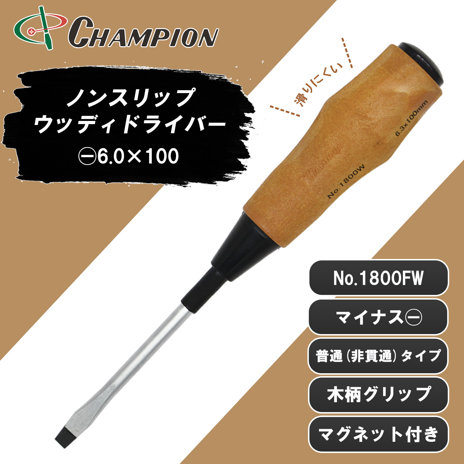 マイナスドライバー -6.0×100 マイナス 普通タイプ 丸軸 マグネット付き 木柄 日本製 6mm 100mm ドライバー ノンスリップウッディドライバー No.1800FW