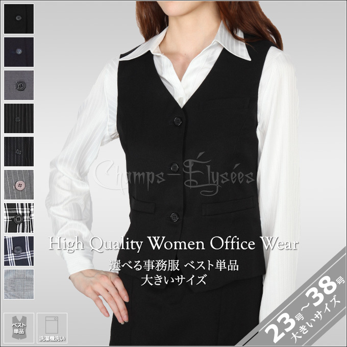 | コメント | 機能性、着易さ抜群の大きいサイズ ベストの単品販売になります。 サイズは23号 26号 30号 34号 38号になります。 ご家庭の洗濯機でお洗濯可能なウォッシャブルタイプになります。 人気のストライプ柄、チェック柄、そして人気色の無地と豊富に取り揃えております。 素材はTR素材を使用し、上品でワンランク上の事務服をお試しください。 撥水加工を施してあり、水はじきが良く、汚れなどにも強いお勧め事務服です。 抗菌・消臭効果のあるデオドラントテープを施し、汗などの臭いもブロックします。 吸汗速乾機能も兼ね備えてこれからの季節に重宝します。 ベストは前面に3箇所のポケットがあります。 左右のポケットは携帯が入る十分な深さもあり、機能性も充実しております。 ベストの単品販売です。 まとまった枚数をご希望のお客様はお問い合わせください。 (ブラウス、スカートは別途販売中です。) |