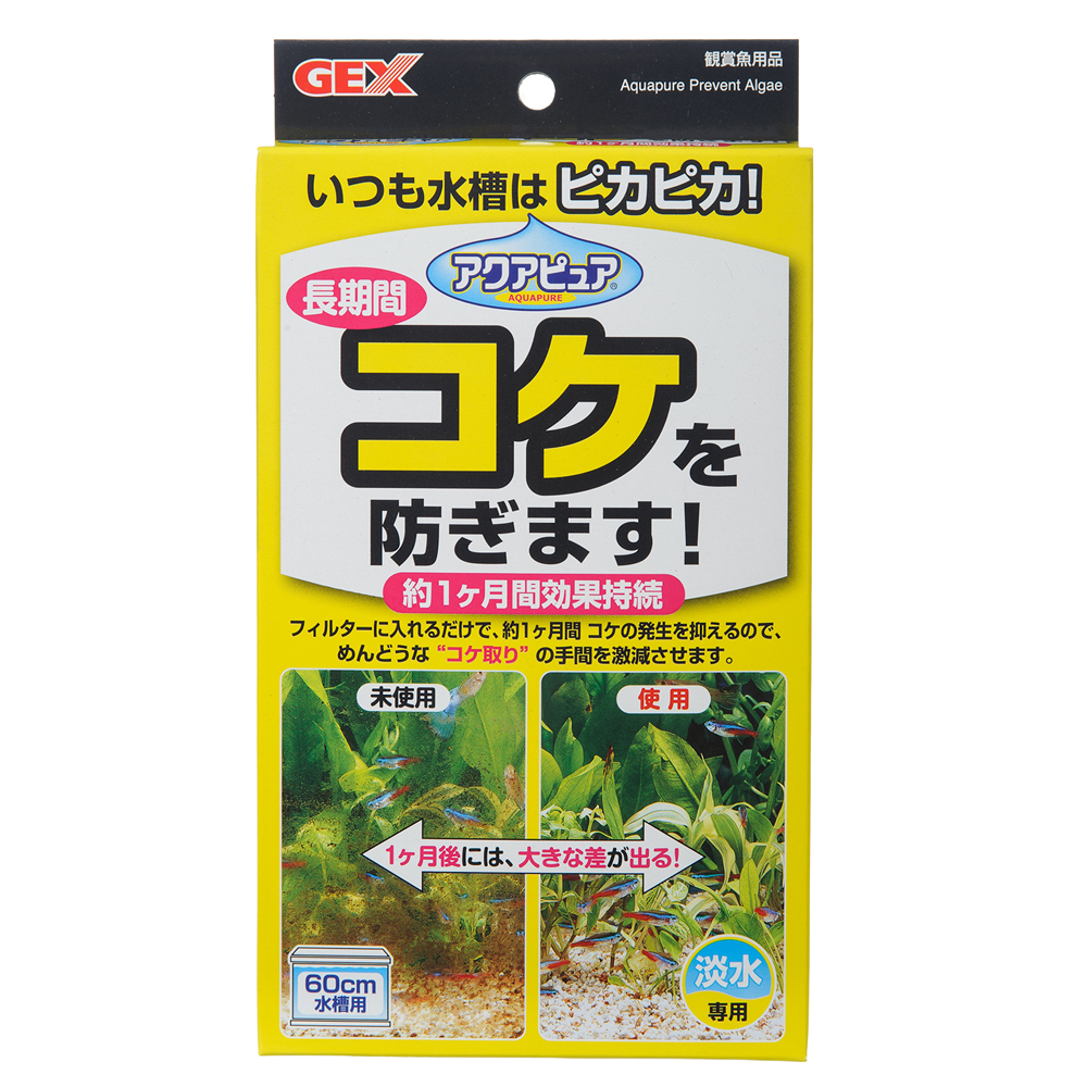 | 特長 | ●フィルターに入れるだけで、コケの発生を約1ヶ月抑えます。 ●速効性が高く、急なコケや藻の発生に効果を発揮します。 ●観賞魚、水草や微生物に悪影響を与えないので、安心してご使用いただけます。 |