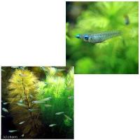 種類詳細 | アフリカ、シェラレオネ、ナイジェリア、カメルーン原産のメダカです。 名前の通り青く光る眼が特徴的で、その清涼な美しさから非常にポピュラーな種です。 体色は地味ですが成魚は各ヒレが黄色く色づき、オスはヒレが伸長しさらに美しい姿となります。 水草水槽に群泳させると非常に美しく、シダなどを用いたやや暗めの水景では青い眼がとても良く目立ちます。 飼育は一度落ち着けば容易ですが、若干水質の変化に弱い一面があり、新しい水を好みます。 |