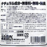 | 用途 | ●トイレの前後に数回スプレーしてください。無香量だから芳香剤特有の複合臭を発生させることなく消臭除菌できます。 ●雑菌だらけのお散歩後に、お家に雑菌を持ち込まないためにも、ペットの清潔のためにも、お散歩後にはスプレーすることを習慣づけてください。 ●シャンプーやトリミングの最後にスプレーすることで消臭・除菌対策になります。 ●犬小屋・ペットの寝床・お部屋・ドライブ後の車内など、嫌な臭いが気になる場所にスプレーしてください。消臭と空間除菌に効果があります。 |