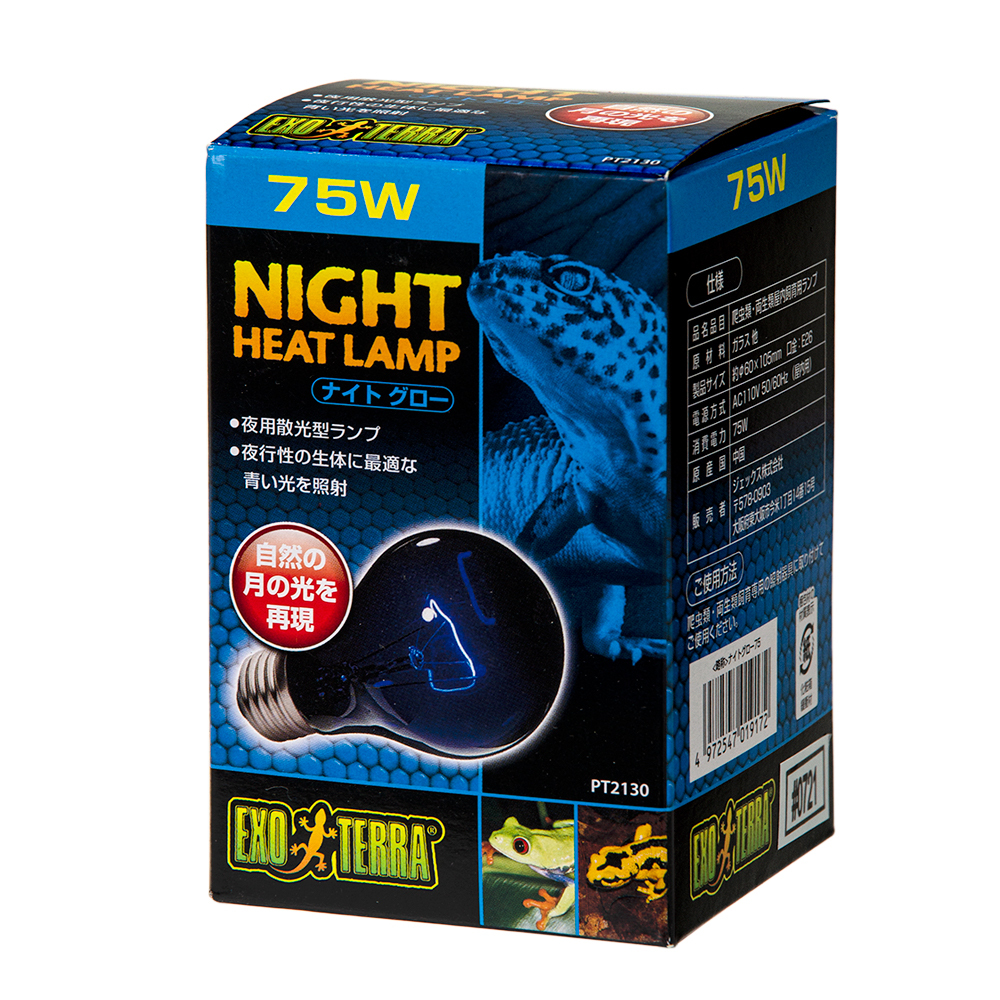 | 特長 | ●砂漠・熱帯環境テラリウム用に最適な夜用散光型ランプ! ●青い光は、夜行性の生体のために、自然に近い活動環境を作ります! ※UVBは含まれておりません。紫外線を照射したい場合は「レプティグロー」や「レプティグロー コンパクト」などの紫外線灯を別途御購入ください。 ※「サングロー」と組み合わせて使用することをオススメします。 |