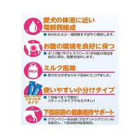 | 特長 | ●愛犬の体液に近いイオン組成で、失われた水分・イオンをすばやく補給できるおやつです。 ●オリゴ糖(ラクトスクロース)が健康をサポートします。 ●持ち運べて与えやすいスティックタイプなので、防災の備えにもおすすめです。 ●愛犬の好きなミルク風味のゼリーです。 |