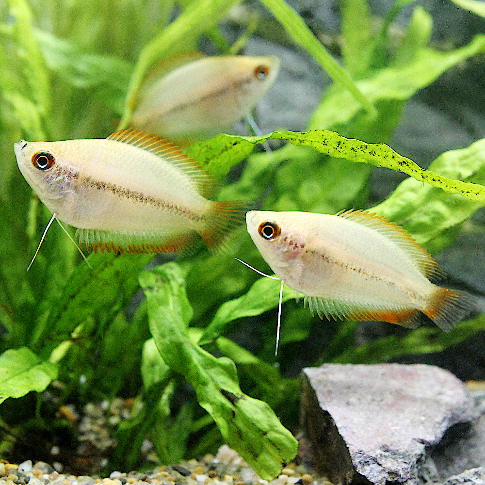 | 種類詳細 | インド原産のハニードワーフグラミーの改良品種です。 通常のドワーフグラミーよりさらに小型の種で、成長しても4cm程度の体長と、混泳に適した温和な性格から人気の種です。 原種は褐色のやや地味な種ですが、繁殖期のオスはオレンジの体色と黄色の背ビレが美しく、喉下が黒くなります。 本タイプは全身がゴールデンの体色に改良され、赤い尾ビレとのコントラストが大変美しく、人気のタイプです。 ゴールデンタイプには体色の黄色味にバリエーションが見られ、本タイプは赤みの強いタイプです。 飼育は、ゆったりとした動きなので、水槽内の水流は弱めにしてあげたほうが良いです。 また、腹ビレが長いため、ヒレをつつくスマトラ等との混泳は避けた方が良いでしょう。 繁殖は他のアナバンティ同様にオスが泡巣を作るタイプです。 |