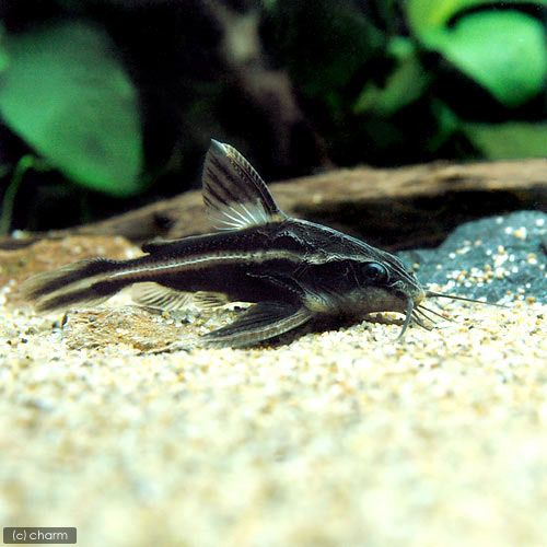 | 種類詳細 | 南米に広く生息するナマズの仲間です。 大きな頭部をもつ独特の体型と、黒褐色の体色に白のストライプ模様が美しい種で、大きな目と動物的な顔つきが人気の種です。 全身を体側に沿って生える棘と、硬くて頑丈な背ビレと胸ビレの棘条で武装し、水槽から出したときにはこの胸ビレの棘条をこすり合わせて“ギーギー”と鳴くことで知られます。 飼育は容易で、夜行性で照明がついてるときは物影でじっとしていることが多いです。 餌はアカムシやナマズ用のタブレットフードを与えるとよいでしょう。 性格は温和で混泳も可能ですが口に入るサイズの魚は捕食されてしまうので注意が必要です。 移動の際は網ですくうと棘が引っかかるので、小さな器などですくってあげるとよいでしょう。 |