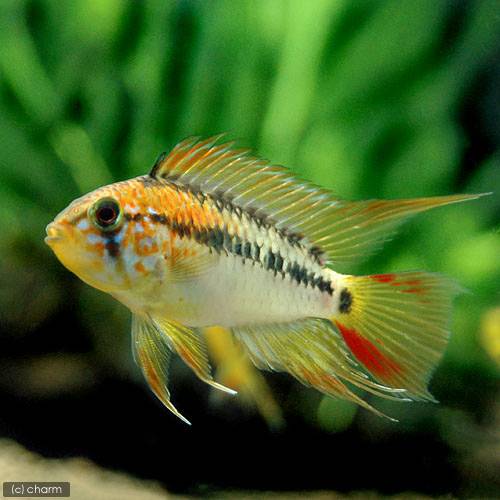 | 種類詳細 | コロンビア原産のアピストグラマです。 ドイツやヨーロッパなどでブリードされた美しい個体が流通し、良く似たアピストグラマ・ヴィエジタの名で流通することも多いです。 アピストグラマ・ヴィエジタと同時に記載され、色彩、分布に非常に近い点があることから亜種や交雑種の可能性も示唆され、多くは混同されている場合がほとんどです。 ブリード個体は頭部の赤い色彩や尾ビレの赤いスポットが強調され派手な美しさを持っています。 飼育、繁殖は容易ですが、やや低めのpHを好み、細菌性の疾患に侵されやすい点に注意が必要です。 エサの与えすぎで美しいプロポーションが崩れやすいので、エサを控えめにして太り過ぎないように注意が必要です。 |