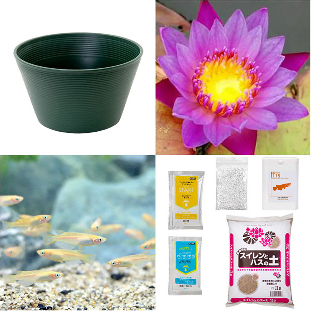 | セット内容 | ●熱帯性スイレン紫×1 ●睡蓮鉢×1 ●スイレンとハスの土3L×2 ●水辺植物用肥料 ●ひめだか×6匹 ・説明書×1 ・カルキ抜き・餌サンプル×1 |
