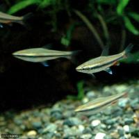 | 繁殖 | 本種は繁殖の難しいペンシルフィッシュの中でも繁殖例が知られています。 発情したオスは鮮やかな色彩を放ち、テリトリーを主張するようになります。 メスは十分に成熟すると抱卵してふっくらとしてきます。 オスが盛んにメスを追うようになり、水草の根元等にばら撒くように産卵します。 |
