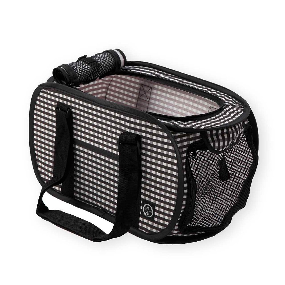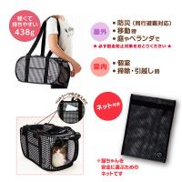 | 特長 | ●猫にストレスを与えない空間を確保しています。 ●2つある開口部は撥水布とメッシュ窓の二重構造で安心です。 ●折りたたんで収納することができます。 ●猫を落ち着かせ、安全に運べるネット付きです。 ●ポケットが2箇所ついているので、トイレシートやタオルを入れることができます。 ●水洗いができるので、いつでも清潔です。 |