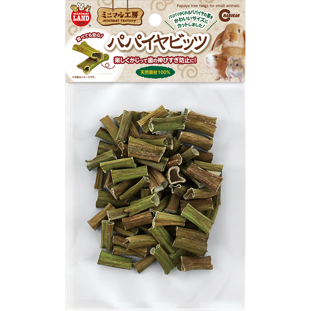 | 特長 | ●パパイヤの木の茎をかわいいサイズにカットしたかじり木です。 ●小動物のストレス解消にぴったりです。 ●たべても大丈夫な素材ですので安心してご使用いただけます。 ●楽しくかじって歯の伸びすぎ防止になります。 |