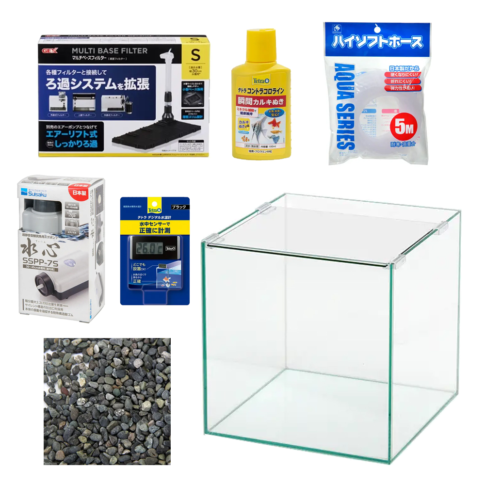 | セット内容 | 【ケージ】アクロ30Nキューブ(30×30×30cm) ●高いインテリア性で人気のオールガラス水槽です。 ●シンプルで小さいながら存在感十分のレイアウトを楽しんで頂けます。 ・付属品:ガラスフタ(28.5×22.5cm)、フタ受け(4個)、専用マット 【フィルター】GEX マルチベースフィルター S ●水槽サイズに合わせてろ過面積調整可能な底面フィルターです。 ●砂利がろ過槽内に入りにくい薄型スリム設計。 【エアー】水作 水心 SSPP−7S(エア量固定式) 30〜45cm水槽用 ●静音性に定評のあるエアーポンプです。 ●フックを引っ掛ける為のリングが付いており吊るして使用することにより更に静音性を高める事ができます。 ●交換パーツはユニット部を丸ごと交換する形なので簡単に交換が可能です。 ●パワーもあるので分岐コックにつなぐことも可能です。 【エアチューブ】貝沼 ハイソフトホース シリコンタイプ(ホワイト) 5m ●材質はシリコンタイプの高重合塩化ビニールを採用していますので、かたくなりにくく折れ癖がつきにくい為、長い時間の使用にも快適にご使用できます。 【底砂】No.15 Classic(大磯砂)ラージ 3リットル ●観賞魚用底砂の定番、「大磯砂」の大粒タイプです。 ●30cmの水槽に最適な量となっております。 【水質調整剤】テトラ コントラコロライン 100ml ●熱帯魚・金魚などの水槽設置時・水換え時のカルキ抜きです。 ●水道水に含まれる魚に有害なカルキ(塩素)やクロラミンを速やかに中和します。 ●ミネラル(ヨウ素化合物)を含み、水道水を自然環境水に近づけて、魚の活力を維持する水に調整します。 【水温計】テトラ デジタル水温計 ブラック BD−1 ●水温センサーのみを水槽内に設置するタイプの水温計です。 ●本体は水槽壁面に取り付けても、水槽台に置いてもご使用できます。 |