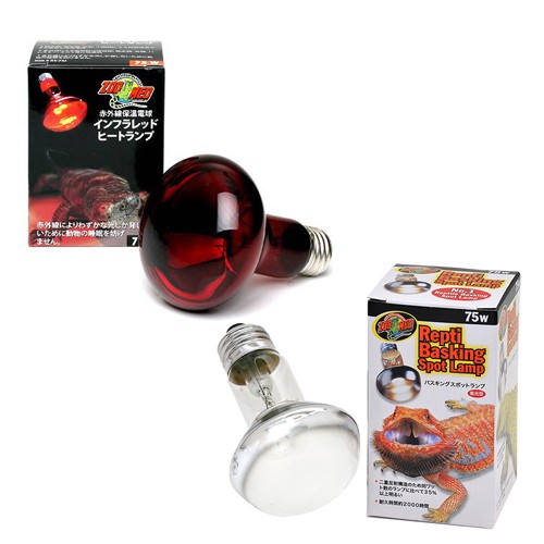 | 特長 | 【ZOOMED 赤外線保温電球 インフラレッドヒートランプ 75W】 ●対象の生体に24時間使用できる最適な保温電球です。 ●赤外線による熱照射は対象の生体に効果的といわれています。 ●赤外線によりわずかな光しか発しないために動物の睡眠を妨げません。 【レプティ バスキングスポットランプ 75W】 ●爬虫類、小動物向けのバスキングスポットランプです。 ●爬虫類本来の活動サイクルを促す紫外線UVAを照射します。 ●二重反射構造のため同ワット数のランプに比べて35%以上明るいランプです。 ●耐久時間約2000時間です。 ●ビーム状に光を照射するので、日光浴するためのホットスポットを作成するのにおすすめです。 |