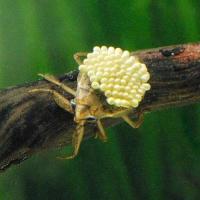 | 繁殖 | 自然下では、5〜7月にかけて産卵が行われます。メスはオスの背中に卵を産みつけ、ふ化するまでオスが背中に卵を付けたまま生活します。1ヶ月程度すると卵から幼生がふ化し始めます。幼生は共食いをしやすいため、小型の巻貝類などの餌を切らさないように注意しましょう。 幼虫は大食漢で水を汚しやすいのでこまめに水換えするようにしましょう。 |