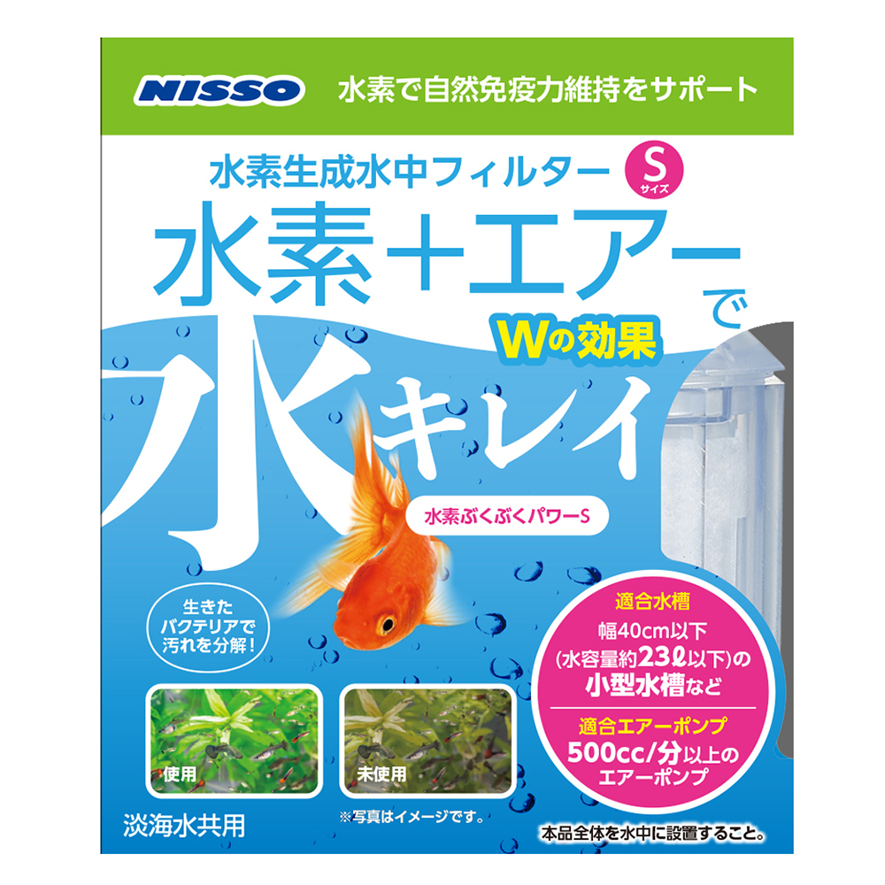 | 特長 | ●水素生成水中フィルターです。 ●水素には魚の自然免疫力をサポートする効果やコケの発生を抑制する働きがあります。 ●従来の水中フィルターのように、物理ろ過・生物ろ過・吸着ろ過だけでなく、水素の力を加えることで魚が喜ぶ美しくクリアーな水を作り、魚本来の自然免疫力をサポートします。 |