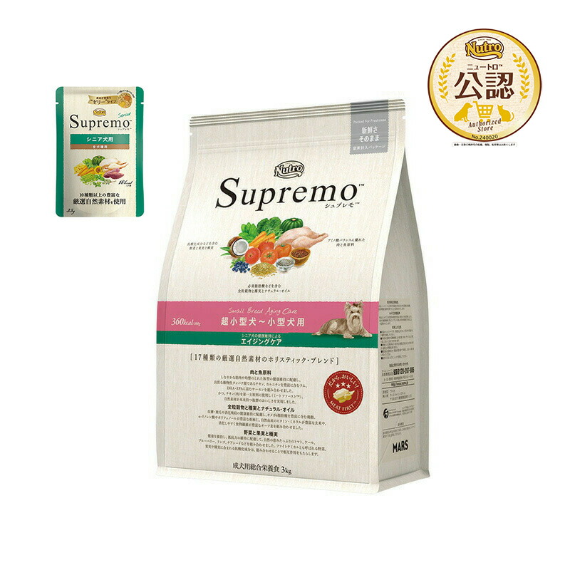 | Supremo 超小型犬〜小型犬用 シニア犬用(エイジングケア) 3kg + パウチ 1袋 おまけ付 | |