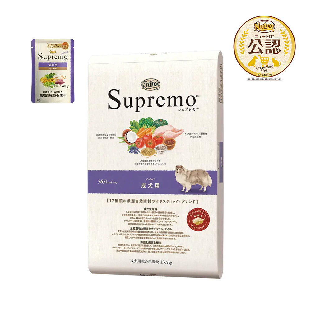 | Supremo 成犬用 13.5kg + シュプレモ ミニパウチ おまけ付 | |