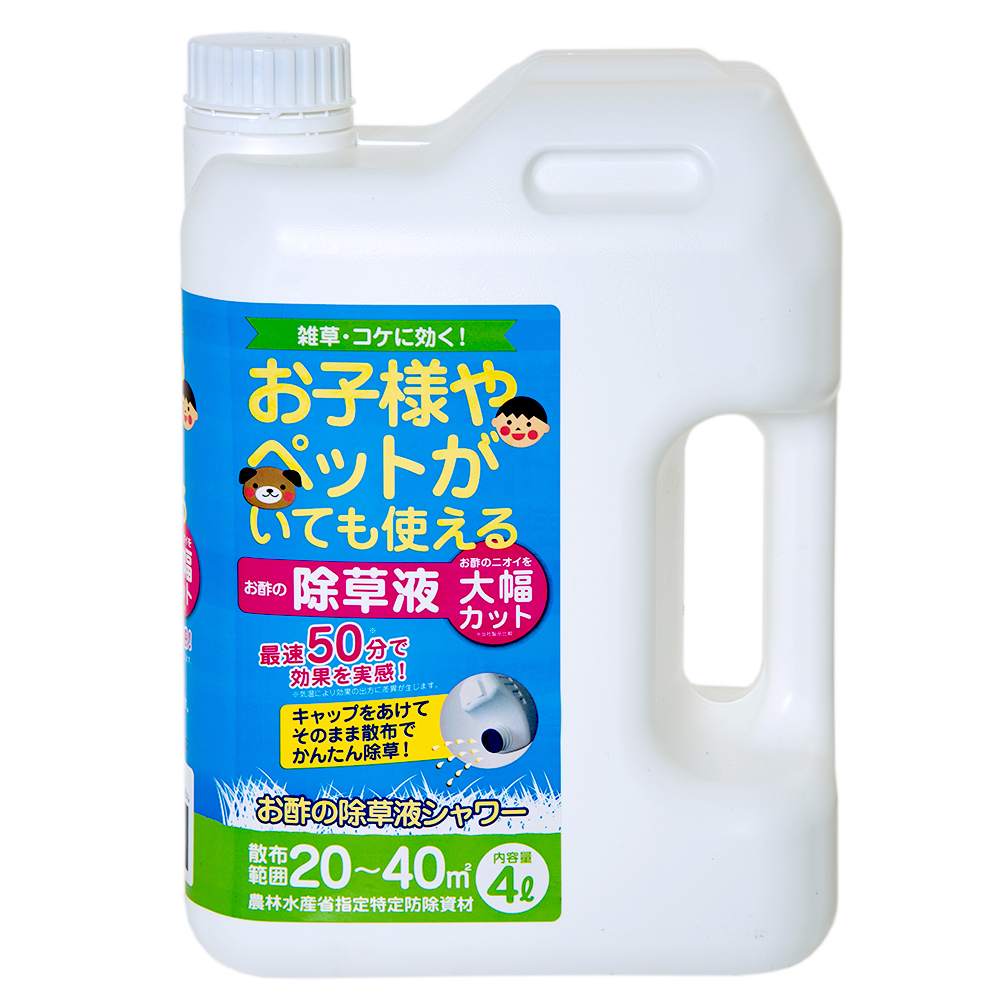 | 特長 | ●100%食品原料のお酢を使った今までに無い天然除草剤です。 ●原料は食品成分のみ使用しているのでお子様やペットを飼っていらっしゃるお客様に安心して使用いただけます。 ●最速50分で効果を実感できます。 ※気温により効果の出方に差異が生じます。 |