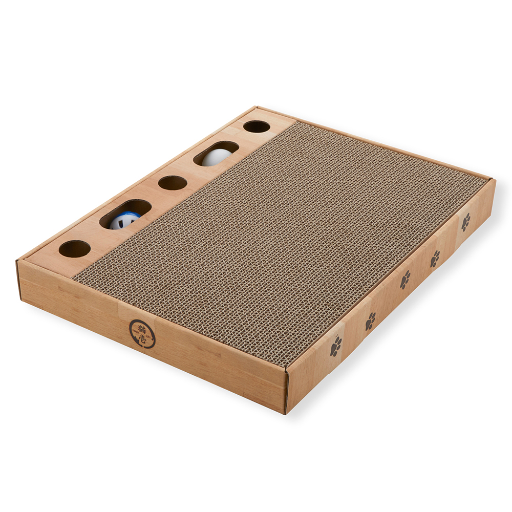 | 特長 | ●つめとぎ兼おもちゃの第2弾です。 ●2種類のコロコロボールで遊んだり、つめとぎしたりと楽しさいっぱいです。 ●つめとぎスペースは余裕のある広さで、ひと休みのときはゴロゴロもできます。 ●デザインは木目調を基調とし、インテリアを邪魔しないシンプルなデザインになっています。 ●正面には猫のフェイスマーク、背面には猫壱ロゴ、側面には猫の足跡模様を加え、可愛らしさもプラスしました。 ●100%紙のダンボールを使用しており、原料となる紙のうち10%はニュージーランド産の原パルプ紙で、つめとぎ後のカスも少なくなっています。 ●ダンボール部分の接着には植物(とうもろこし)由来の糊を使用しており安心安全です。 ●猫ちゃんの可愛い姿が見られること間違いなしです。 |