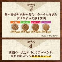 | 原材料 | チキン、ツナ(DHA源)、鶏レバー、小麦、調味料(アミノ酸等)、ビタミン類(B1、B2、B6、B12、E、K、コリン、ナイアシン、パントテン酸、ビオチン、葉酸)、ミネラル類(Ca、Cl、Cu、Fe、I、K、Mg、Mn、Na、P、Zn)、タウリン、増粘多糖類 |