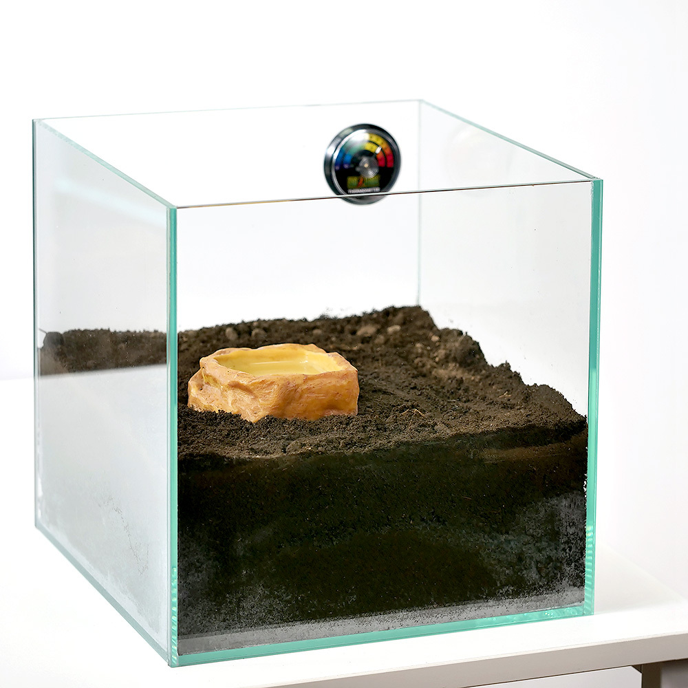| セット手順 | 1.水槽に黒土1袋を入れます。 2.水約300mlを回し入れ、土が均等に湿るようにします。 3.その上から残りの黒土1袋を入れます。 ※表面付近の土は乾燥、底に行くに従って湿っていくような状態にします。 4.水槽の端にウォーターディッシュを設置し、水を入れます。 5.アナログ温度計を見やすい位置に設置します。 6.アメフクラガエルを入れてセット完了です。 7.アナログ温度計の設置方法につきましては、本サイトの該当商品ページ、またはパッケージをご参照ください。 |