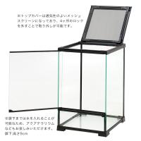 | 特長 | ●テラリウムなど、様々な用途に使用できるガラスケージです。 ●正面扉はしっかりとロックされるため、生体が脱走してしまう心配がありません。 ●トップカバーは通気性のよいメッシュスクリーンになっており、4ヶ所のロックを外すことで取り外しが可能です。 ●コードや6mmまでのチューブを通せる穴が4ヶ所あるため、ミスティングなども容易に行えます。 ●使用しないコード穴は閉じておくことができるため、生き餌などが脱走する心配もありません。 ●扉下までは水を入れることが可能なため、アクアテラリウムなどもお楽しみいただけます。 |