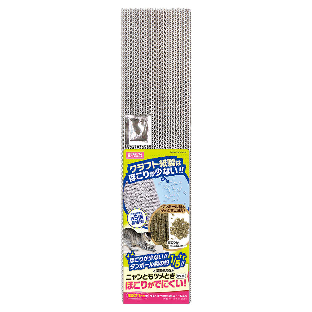 | 特長 | ●ほこりが少ないクラフト紙製の爪とぎです。(段ボール製の約1/5(当社比) ●両面使えますので経済的で、丈夫な紙質なので約5倍長持ちします。(当社調べ) ●猫ちゃんの大好きなまたたび粉付きです。 |