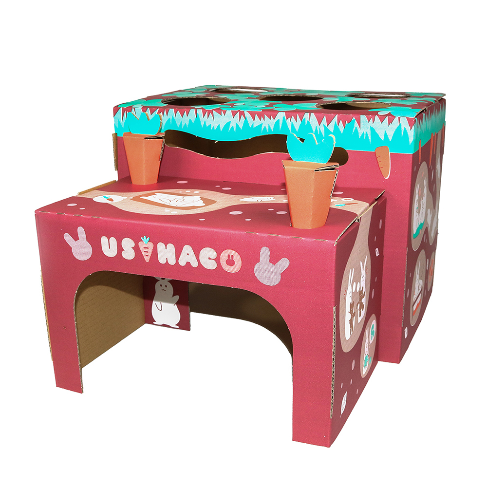 | 特長 | ●のぞいて、かくれて、顔を出して!運動不足の解消に、部屋んぼ時の遊び場になる、BOX型のおもちゃです。 ●なかよく暮らすウサちゃんたちのイラストがかわいい、にんじん畑をイメージしたダンボール製です。 ●安心して隠れられる事はもちろん、上面や側面の穴から顔をのぞかせる姿はとってもキュート!ぴょこっと顔を出したときに頭をなでなでしたり、おやつをあげたりして、コミュニケーションを取りながら遊べます。 ●トンネル部分は取り外しが可能で、おもちゃとしても遊べるにんじんも付いています。 |