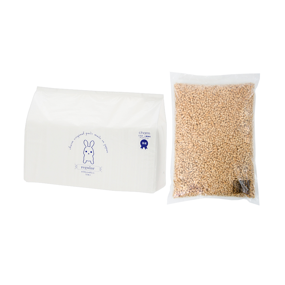 | 効果&特長 | 小動物用のペットシーツとトイレ砂のセットです。 【うさぎ用 ペットシーツ レギュラー 薄型 50枚(45cm×34cm)国産 ペットシート】 ●使い勝手のレギュラーサイズ薄型タイプのペットシートです。 ●ポリマーシート(高分子吸収材)がオシッコをすばやく吸収&ニオイをキャッチします。 ●白いシートだからオシッコの色がわかりやすく、健康チェックに便利です。 ●安心の国産品です。 ●うさぎさんの場合、約1日のおしっこの量を吸い取ります。 (あくまでも目安です。体重1.5kg以上の場合、または水をよく飲む子の場合、1日1回以上交換が必要な場合もあります。) ●四角トイレの場合はトイレのサイズに合わせて左右上下を折りたたんでご使用ください。 ●三角トイレに使用する場合は左右のコーナーを折りたたんでご使用ください。 【ウッドペレット 7L】 ●木材を原料としたペレット状のトイレ砂なのでペットにも安心してご使用になれます。 ●抜群の水分吸収力、消臭力と自然の香りでペットも人も快適にすごせます。 ●水気(オシッコ)を取るとペレットがふくらみ、木粉状になります。 ●汚れて捨てたペレット分だけを補充するだけ! ●木粉状になったウッドペレットはトイレ等にくっつきにくく掃除がとても簡単です。 |