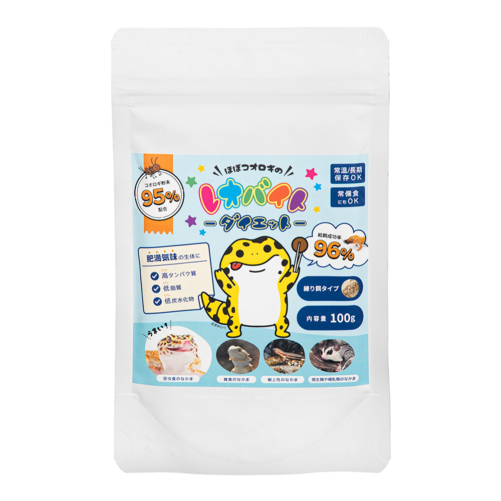 | 特長 | ●レオバイトダイエットはタンパク質を多く含むコオロギだけを厳選して、製造した人工飼料です。 ●ヒョウモントカゲモドキやフトアゴヒゲトカゲを中心に、昆虫食の爬虫類に適した餌となっております。 ●給餌成功率は95%と高水準なこともポイントです。 ●タンパク質が高く、脂質が低く、炭水化物が少ないという基礎栄養価から、 ・肥満気味の生体 (与えすぎにはご注意ください。規定量よりも減らすことも念頭に入れてください) ・妊娠直前、直後の生体 (カロリーが高い消化が難しいため。) 【給餌成功例】 ヒョウモントカゲモドキ(特に強い ブリーダー協力のもと、500匹程度で試行し96%の成功率)、ニシアフリカトカゲモドキ(WC)、オバケトカゲモドキ、クレステッドゲッコー、ジャイアントゲッコー(ツギオミカドヤモリ)、チャホウア(マモノミカドヤモリ)、グランディスヒルヤモリ、スタンディングヒルヤモリ、トッケイヤモリ、アオジタトカゲ、フトアゴヒゲトカゲ、サンエステバントゲオイグアナ、エルモシージョトゲオイグアナ、ハリネズミ、フクロモモンガ、ローソンアゴヒゲトカゲ、カラカネトカゲ、ピーターズバンディットスキンク(WC)、ニホンカナヘビ(WC)、ニホントカゲ(WC)、ホオグロヤモリ、ソメワケササクレヤモリ、ヘルメットゲッコー、ベルツノガエル、ミルキーツリーフロッグ、シリケンイモリ、タイガーサラマンダー、ベトナムオレンジレッグ(ムカデ)(幼体) |
