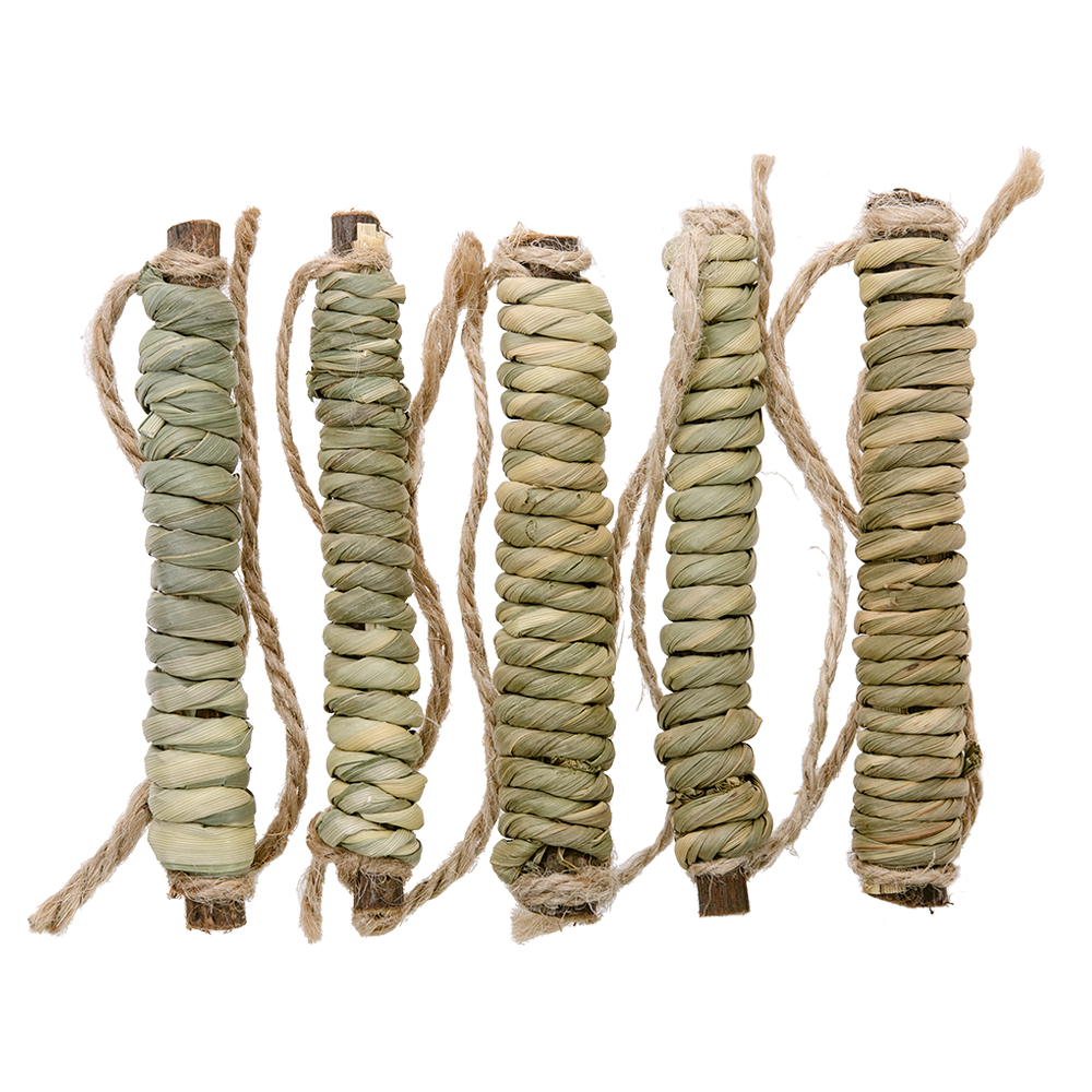 | 特長 | ●マンゴーの木にワラを巻いて作った小動物用のロールスティックです。 ●ガジガジかじって楽しくストレス解消できます。 ●デンタルケアとしてもご利用できます。 ●ケージ固定用の紐が付いています。 ●環境にやさしい自然素材のハンドメイドです。 |
