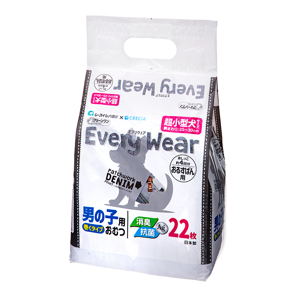 | 特長 | ●超小型犬の男の子におすすめな、巻くタイプのおむつです。 ●消臭・抗菌効果を期待できる「機能性セルロースナノファイバー」を採用しています。 ●全面通気シートでムレを防いで、サラサラな付け心地を維持します。 ●小型犬のおしっこ約4回分(約120cc)を安心吸収するスリムタイプです。 ●おしゃれなデニムデザインで、愛犬とのおるすばん時間も気分が上がります。 |