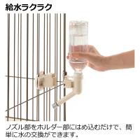 | 特長 | ●ペットボトルを利用するケージ・サークル用給水器です。専用ボトルも付属しています。 ●専用ボトルは2種類の目盛り付きで、愛犬がどれだけ飲んだのかが一目で分かります。 ●サークルの外からボトルを付けるだけでラクラク給水が可能です。 ●ワンタッチ着脱が可能なので、簡単に水の入れ替えが可能です。厚みのあるプラスチックケージでもしっかりと取り付けが出来る優れものです。 ●ペットに合わせて高さを自由に調節できます。 ●厚みのあるプラスチックケージ(16mm未満)でもしっかりと取り付けできます。 |