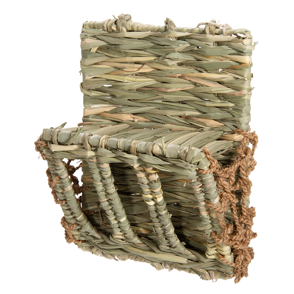 | 特長 | ●チモシーなどの長さのあるスタンドヘイに最適なフィーダーです。 ※スタンドヘイとは:フィーダーに差して与える長い牧草のことを指します。 ●牧草のこぼれ防止のガードと、イタズラ防止のケージ固定用紐付きです。 ●環境にやさしい自然素材のハンドメイドです。 ●牧草がたっぷり入るワイドタイプです。 |