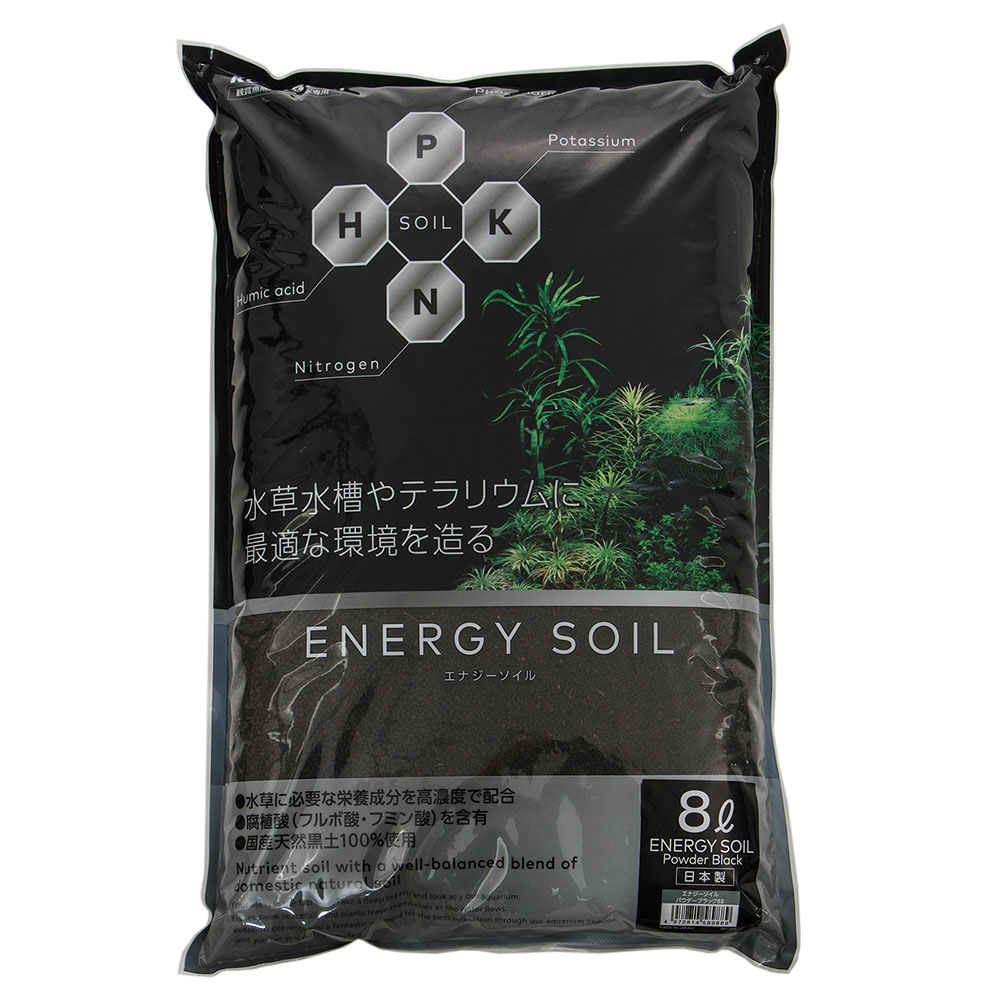 | 特長 | ●エナジーソイルは良質な国産天然黒土を原料に水草の成長に必要な窒素・カリウム成分やその他微量元素などを絶妙にブレンドした栄養系ソイルです。 ●保肥性にも非常に優れるため、長期間にわたり水草の根が栄養分を効率良く吸収します。 ●比重が大き目のソイルの為、水草の植え込みが容易に行なえます。 ●pHを弱酸性に保つ事ができ、pH6.0〜6.5で安定します。 ●ソイルの粒が崩れにくい為、根腐れが起きにくいです。 ●殺菌処理済みなので安心です。 ●通水性、保肥性が非常に優れ、水草の根張りを良くし、粒の比重が比較的大きいので水草が植えやすいです。 ●従来のソイルより栄養分が長期間持続します。 ●テラリウム用の底床としても使用が可能です。 |