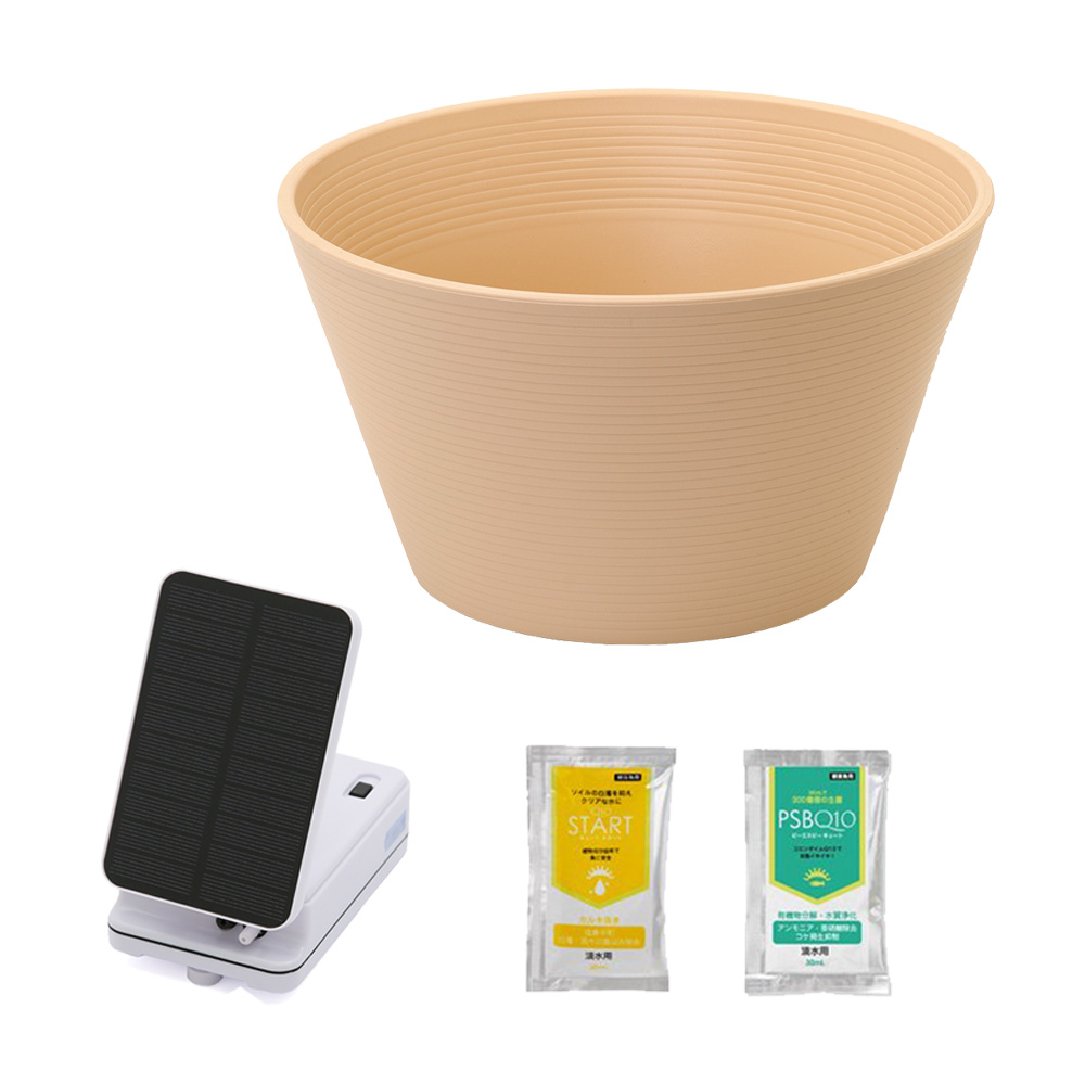 | セット内容 | 睡蓮鉢 ベージュ×1 ソーラー充電式エアポンプ(エアストーン、エアチューブ付属)×1 Q10スタート 淡水用 30mL×1 PSBQ10 ピーエスビーキュート 淡水用 30mL×1 |